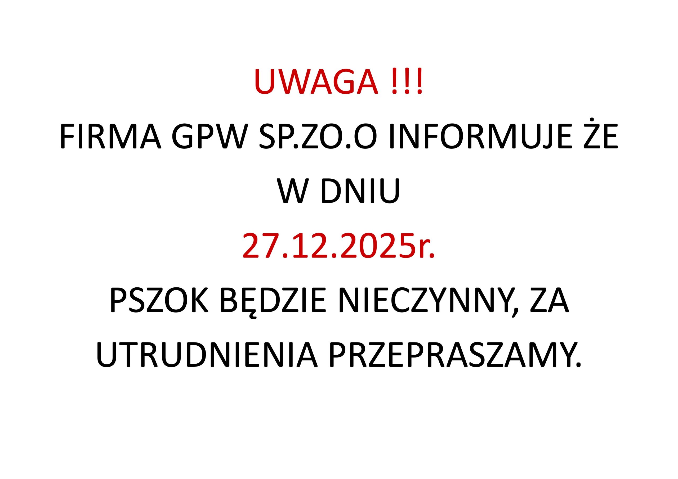 UWAGA !!! FIRMA GPW SP. Z O.O INFORMUJE, ŻE W DNIU 27.12.2025 R. ORAZ 31.12.2025 R. PSZOK BĘDZIE NIECZYNNY, ZA UTRUDNIENIA PRZEPRASZAMY.
