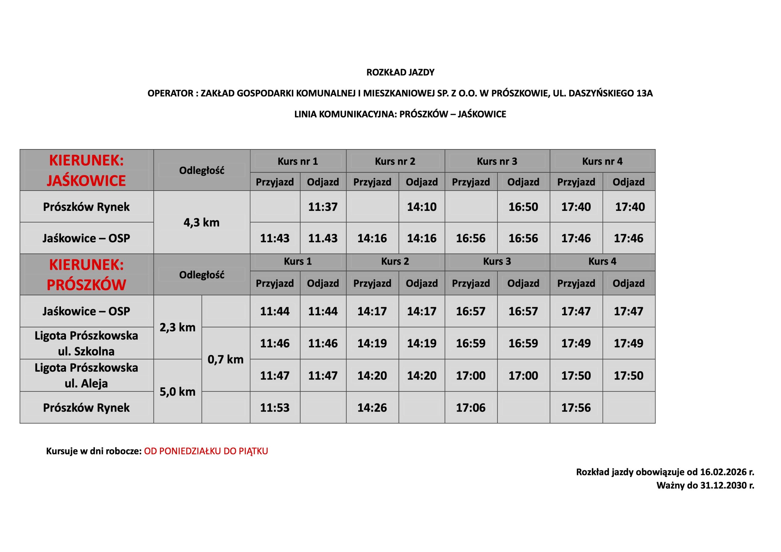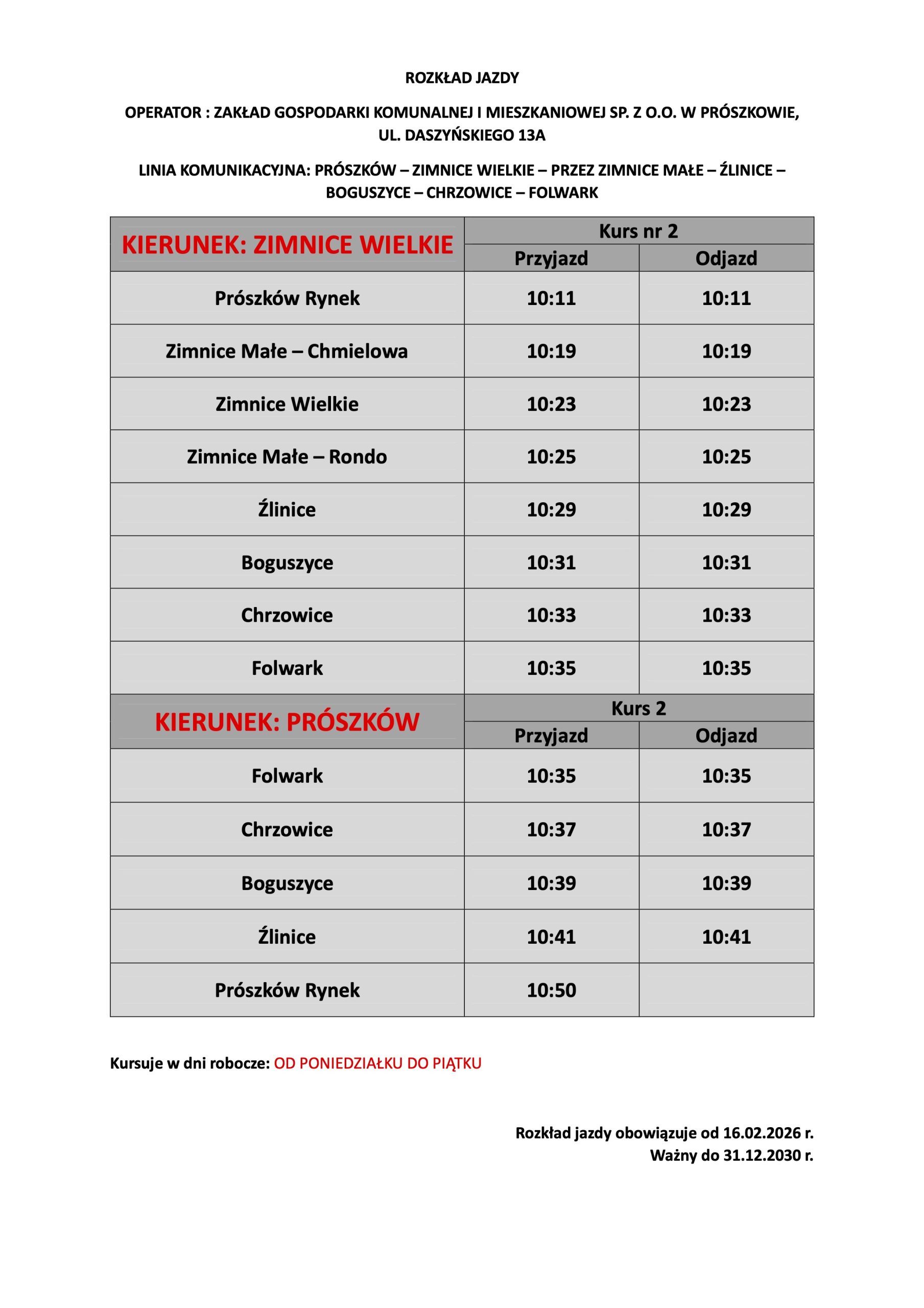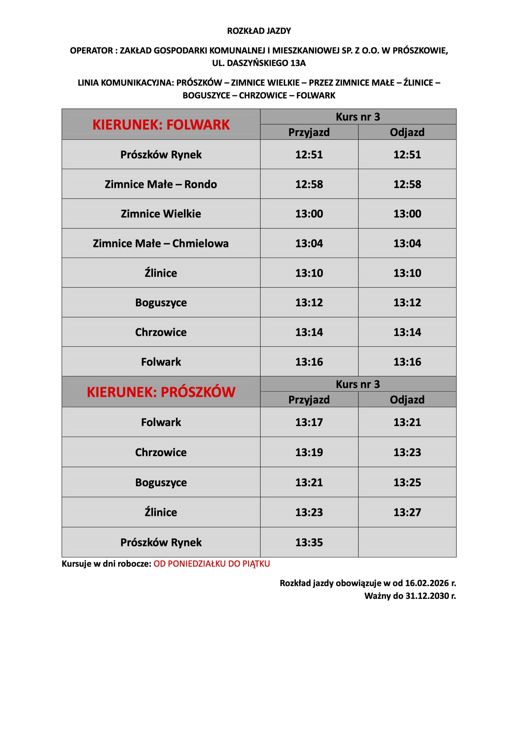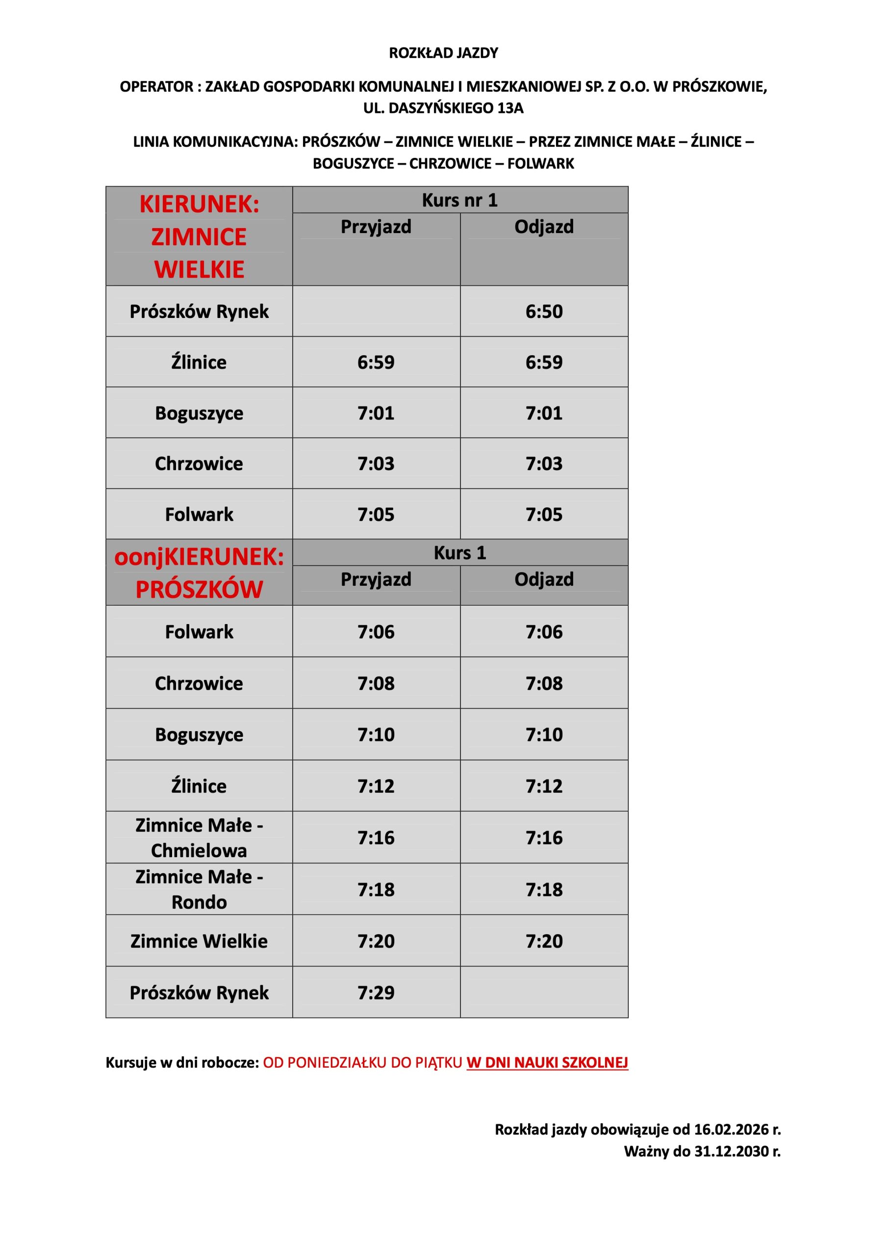 Informujemy, że od 16.02.2026 r. zmianie ulega częstotliwość oraz godziny kursowania gminnej komunikacji autobusowej na linii Prószków-Jaśkowice oraz Prószków- Zimnice Wielkie